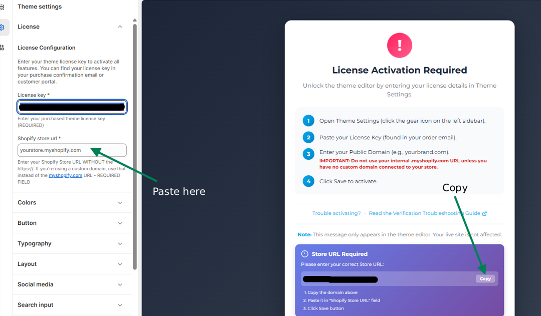 The Store URL linked to the license will autopopuplate on the right screen, you will copy it and paste it to the Shopify store URL field on the left side