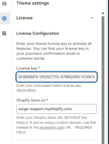 The License Key section in the Surge theme settings is where you activate your theme to unlock all features. This ensures your store is properly connected to your purchase and receives full functionality and updates.